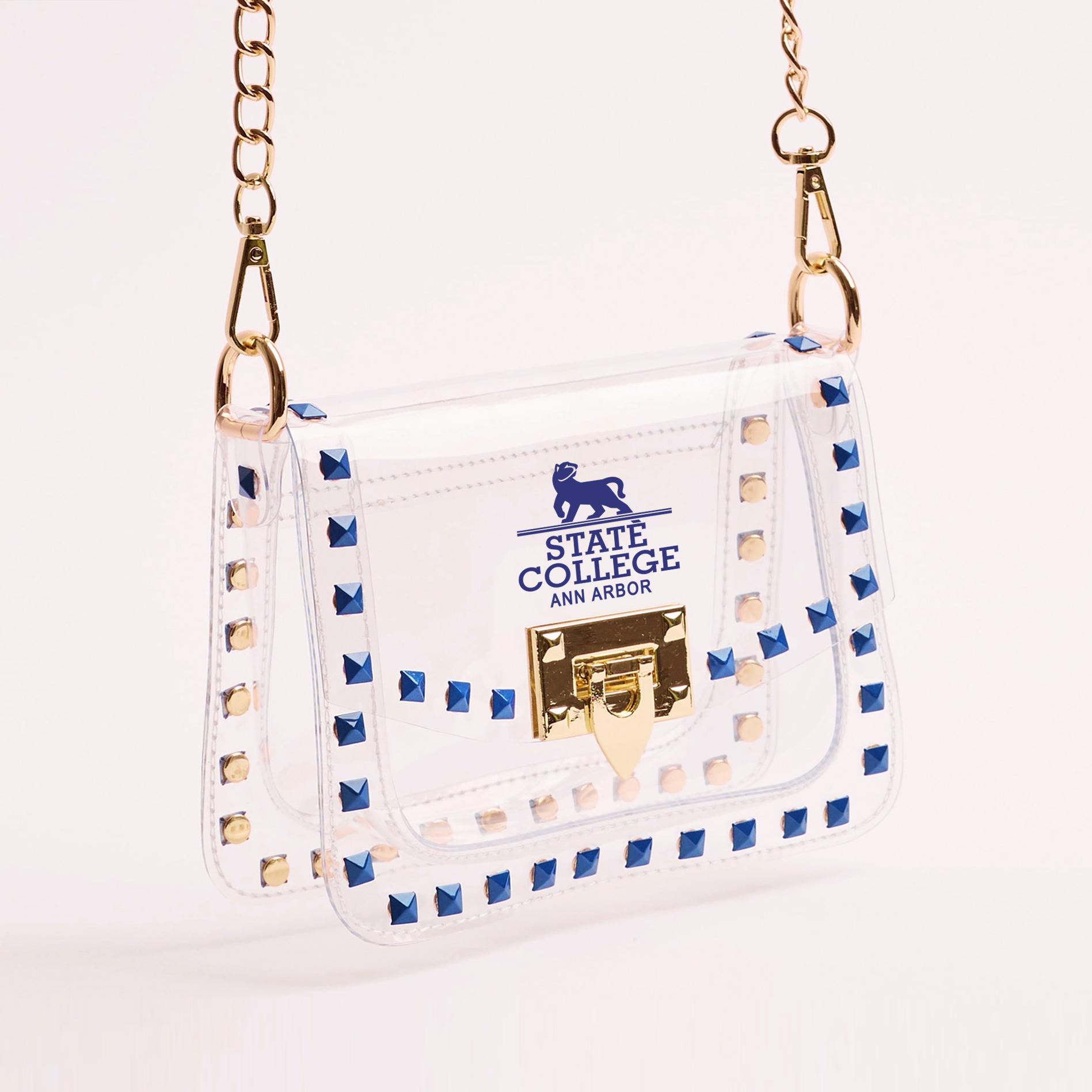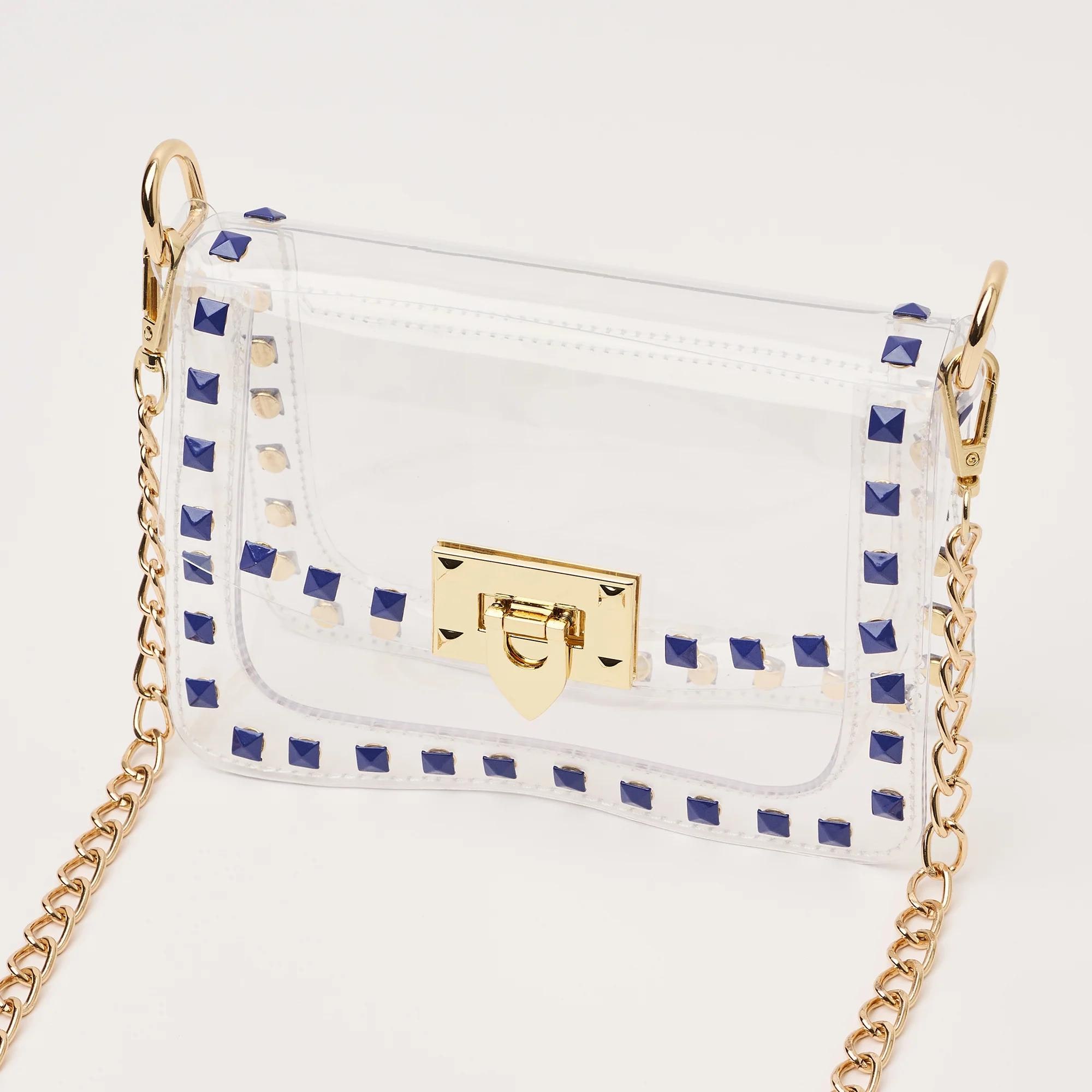 Turn heads while breezing through stadium security with this stylish clear handbag. With bold blue stud accents and a luxe gold chain, this purse blends stadium-approved compliance with chic fashion.