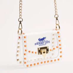 Score with the biggest winner in our clear handbag playbook – This bag changed the handbag game by proving that handbags could be functional and chic. This style includes orange square metal studs and a gold chain. It is NCAA and NFL-compliant and the ideal size to hold your wallet, phone, keys, lip gloss, and a few other small items.