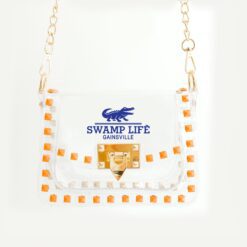 Turn heads while breezing through security with this stadium-approved clear handbag in bold orange accents and a vibrant gold chain. Perfectly blending compliance and fashion, this crossbody is a must-have for sports fans, students, and festival lovers alike.